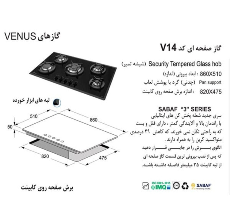 گاز رومیزی اخوان کد V14 دارای 5 شعله است. نمای اجاق گاز شیشه مشکی کار شده است و ابعاد آن 51*86 سانتیمتر است. قطعات اصلی استفاده شده در اجاق گاز V14 ایتالیایی است. راندمان احتراق آن 25 درصد بالاتر از استاندارد است. نوع شعله پخش کن این اجاق گاز طرح ونوس بوده و جای ولوم آن تخت در نظر گرفته شده است. همچنین نوع شعله پخش کن پلوپز آن طرح ونوس است.
