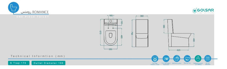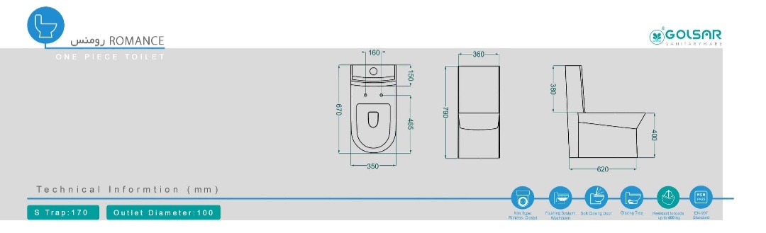 مکانیزم بسته شدن درب توالت فرنگی گلسار مدل رومنس درجه یک از نوع آرامبند است. این نوع درها به صورت هیدرولیک بوده و دارای فنرهای مخصوصی هستند که از بسته شدن ناگهانی در توالت فرنگی جلوگیری میکند. آکس این توالت فرنگی 17 سانتیمتر است. این بدان معنی است که فاصله مرکز خروجی سیفون تا پشت محل نصب توالت فرنگی، 17 سانتیمتر میباشد. خروجی این کار هم 10 سانت است.