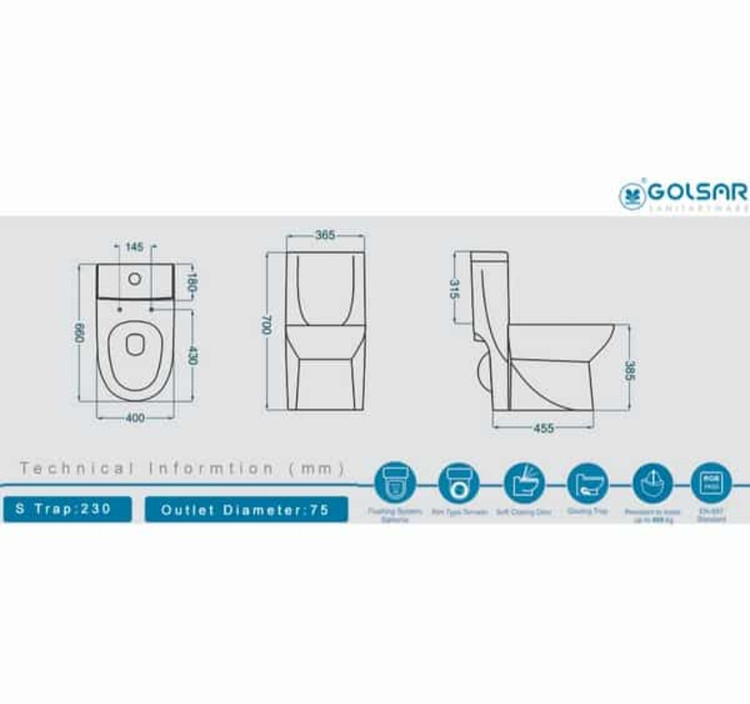 ابعاد این محصول 70*40*66 سانتیمتر است. این توالت فرنگی از سیستم فلاش دوزمانه استفاده میکند. در سیستم فلاش دوزمانه، مخزن تخلیه از دو حجم کوچک و بزرگ آب بهره میبرد. به طوری که برای مواردی که نیاز به آب زیادی برای تمیز کردن توالت وجود ندارد، از حجم کوچک آب استفاده میکند. با استفاده از این سیستم، مصرف آب کاهش مییابد.